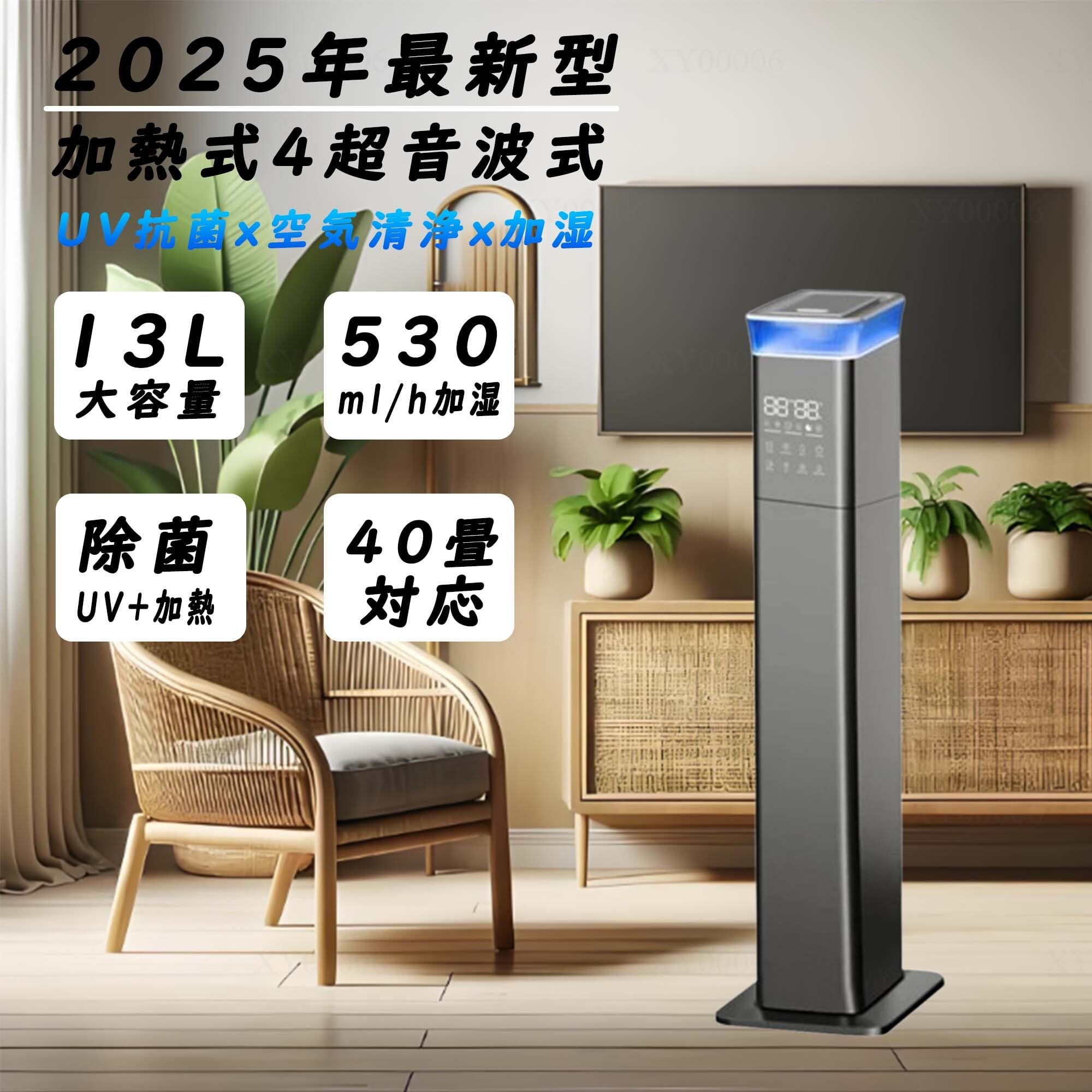 加湿器 スチーム式 大容量 13L 超音波式 空気清浄 40畳 次亜塩素酸水対応 加熱 UV除菌 乾燥対策 湿度調整 省エネ 2025最新 デュアルコア 強力加湿器 タワー型 最大噴霧量1000ML/H 上部給水 リモコン付き 長時間連続加湿 静音 空焚き防止